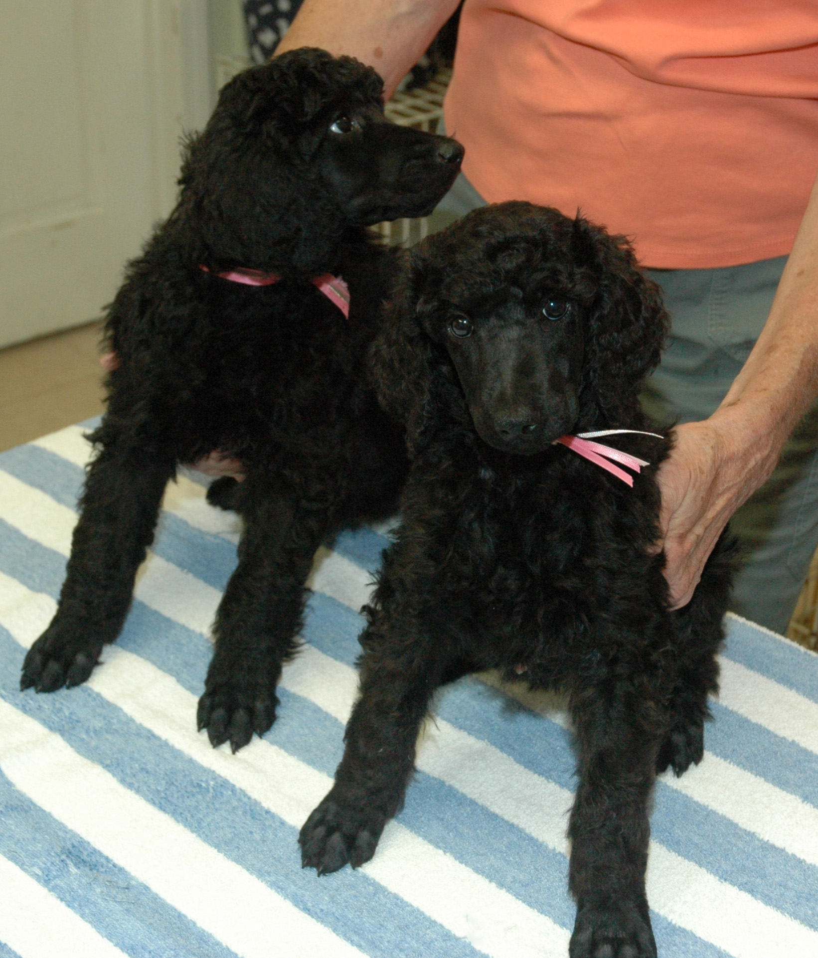 Black and white standard Poodles.. Black miniature Poodles..
